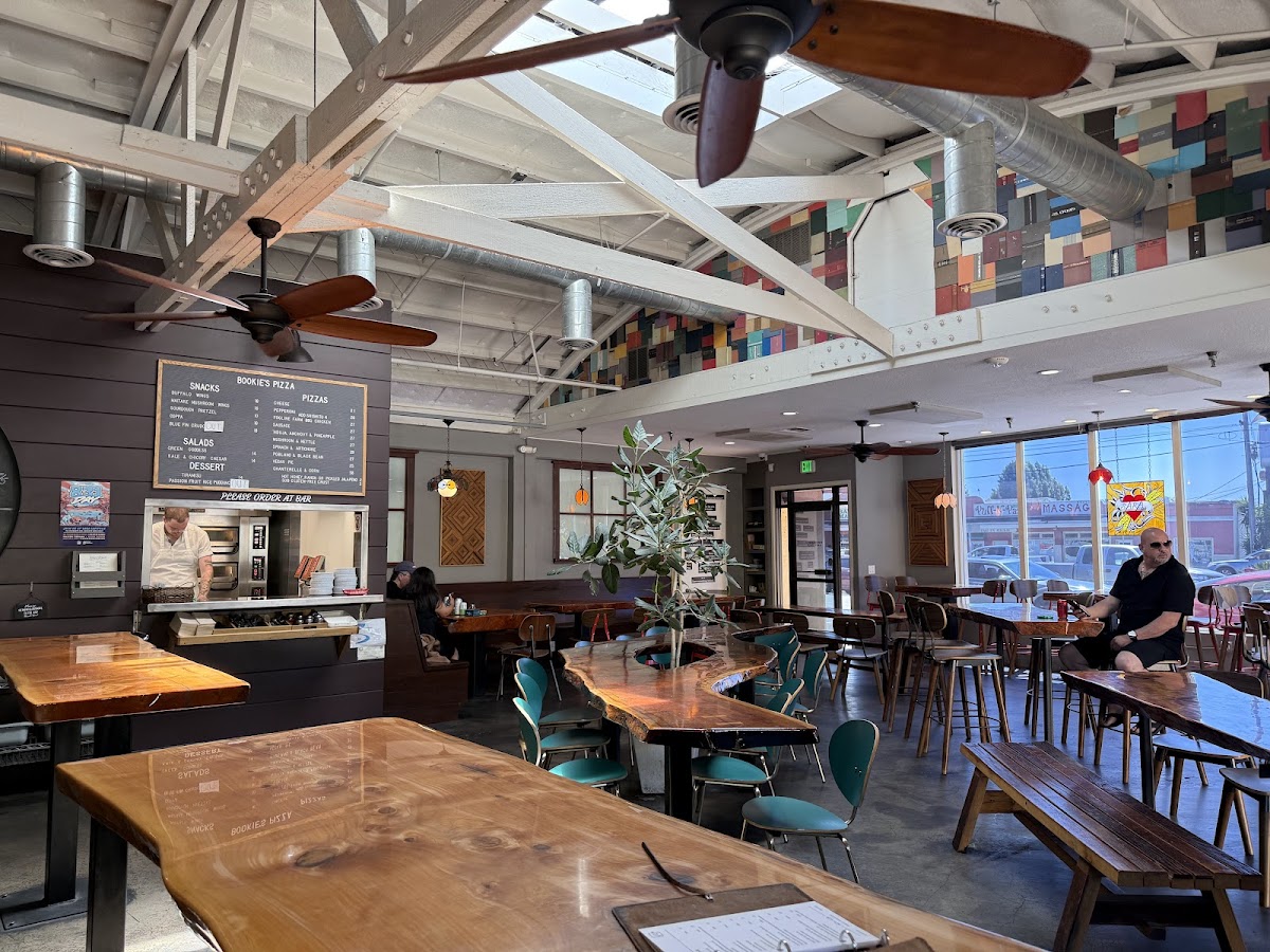 This place is a Santa Cruz gem. We need more places like Bookie’s. This is a favorite spot of ours and I’m fearful to say it on social media so folks don’t start coming. The pizza is freshly made and delicious. Apart from the staple toppings of cheese and pep, the menu is often limited but may provide a fancier vegetarian or meat option. Limited is not a bad thing! Portions are large and pizza is LIGHT AND FLUFFY! I can only eat three pizza slices at a time. The mushroom wings are freaking awesome and if you ever had their desert then you know what I’m talking about. Come to share a table with local residents, kids may be running around or playing with a puzzle, bikes are hung on the wall, bathrooms are accessible and parking is a little tight unless you bike there or park on the street or small parking lot. I highly recommend Bookie’s Pizza and if you don’t like it, there’s a Little Cesar’s around the corner.